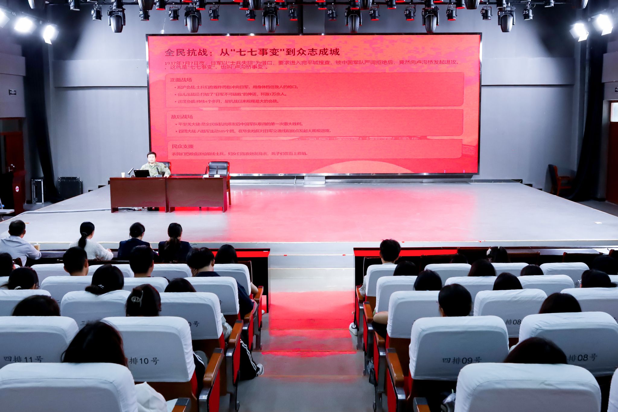 宣讲环节中,宜秀区武装部政治工作科干事丁擎宇以时间为主线,系统回顾了抗日战争波澜壮阔的历史进程。从“九一八事变”爆发到“七七事变”全面抗战,从平型关大捷、淞沪会战中军民团结御敌,到最终迎来抗战胜利的伟大时刻,丁擎宇通过翔实的历史案例,深刻阐释了中华民族在危难之际所展现出的“团结一致、共御外侮”的爱国精神,“不畏艰难、英勇斗争”的英雄气概,以及“天下兴亡、匹夫有责”的民族气节。