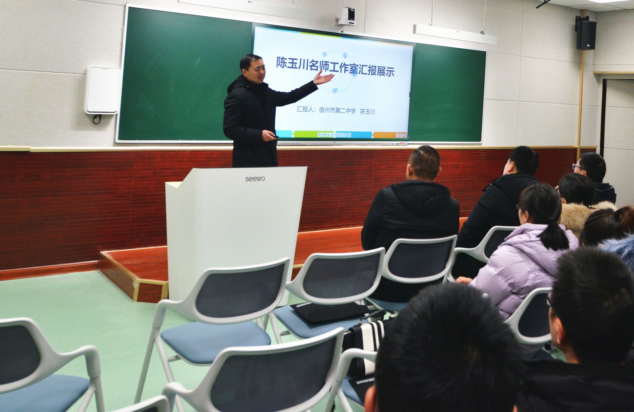 “我竟然会剪辑视频了,以后录课再也不求人了,陈老师太感谢您了”,周老师兴奋地说。2021年教育部开展首届“基础教育精品课”遴选工作,精品课的录制需要专业的设备和剪辑。陈玉川老师主动请缨,选购了绿幕、补光灯等设备,对老师进行细致地培训,坐守录播室帮助老师录制,手把手指导老师进行视频剪辑。在陈玉川老师的努力下,宿州二中在本次活动中取得了优异成绩,2节次获评部级精品课,5节次获评省级精品课,获评数量高居全省第一。无论是课堂教学、教育科研还是教育技术,很多青年教师遇到困难都会想到请教陈老师这个“万事通”。