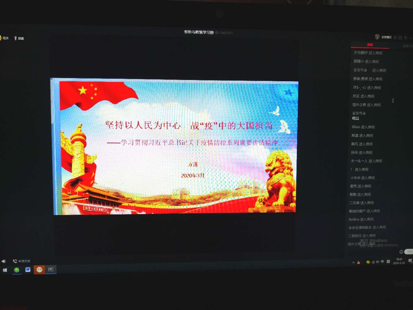 3月26日晚上,365上市公司举办第三期公开示范课。方蓬老师以“坚持以人民中心 战‘疫’中的大国担当——学习贯彻习近平总书记关于疫情防控工作的重要讲话精神”为主题,开展线上教学公开示范课。校长闵永新亲临线上观摩指导,全校近百名教师在线观摩。