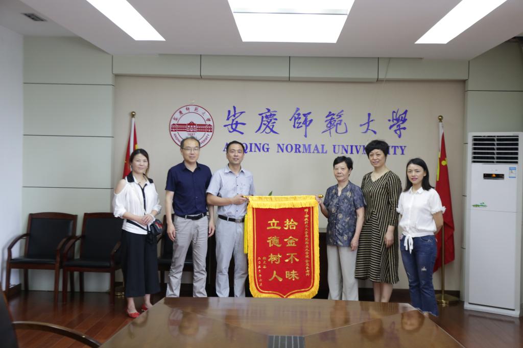 为了表示对金忠良的感谢,失主潮龙琴于6月4日上午同家人及社区的负责人一起专程赶到学校,将一面写有“拾金不昧,立德树人”的锦旗亲自送到了他手中。“那天下着雨,回家途中手里的东西多了,手提包也不知道落在哪了。多亏了金老师热心帮助,通过社区和派出所联系上我,不然啊钱包肯定找不回来了,太感谢金老师了!”潮龙琴向金忠良由衷道谢。
