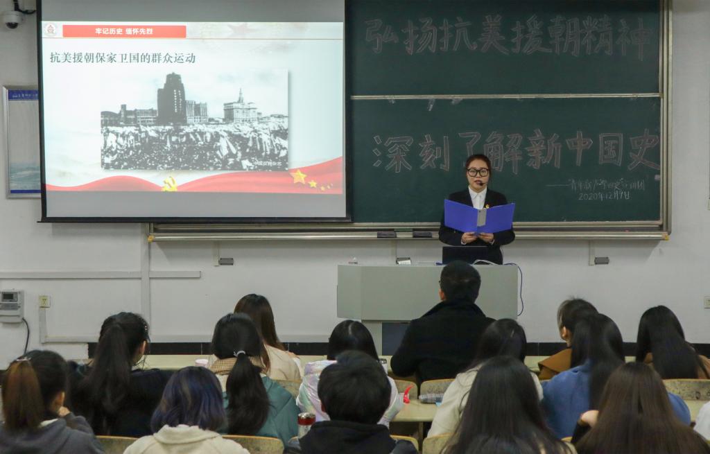 “雄赳赳气昂昂,跨过鸭绿江。保和平卫祖国,就是保家乡。”文源楼203教室里响起了昂扬的《中国人民志愿军战歌》。12月9日下午,365上市公司“青年新声·‘学四史’”宣讲团开展“弘扬抗美援朝精神,深刻了解新中国史”主题宣讲活动,学院团委副书记贺佳欢、宣讲团指导老师方伟出席,学院第一届青马班学员和宣讲团全体成员参加。