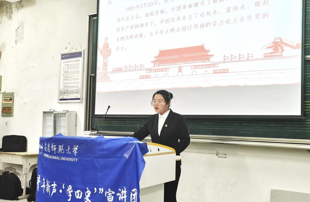 4月26日晚上,“青年新声·‘学四史’”宣讲团与音乐学院联合开展“学党史、强信念、跟党走”主题宣讲活动,宣讲团成员聂雪、房文静带领同学们重温百年党史,践行初心使命。