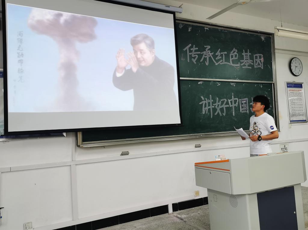 各组大多借助课件展示、播放视频等形式讲述党史故事,通过现场提问的环节提升课堂互动度。“大家看这幅油画,作者描绘邓稼先注视原子弹爆发时的眼神,是那么的坚毅有力,目光如炬。”思想政治教育专业2019级(4)班余涛以邓稼先的画像为导入,重点围绕“邓稼先的报国志”,讲述邓稼先28年隐姓埋名只为潜心研究核武器的光辉事迹。思想政治教育专业2019级(2)班骆雯谈及影片《我和我的祖国》情节时,引发了现场学生的共鸣,“影片中原子弹研究人员高远悄无声息地告别家人和朋友,隐瞒身份前往遥远的地方从事科研工作,甚至冒死挽救即将失败的实验成果。我想他们这种无私奉献的精神与行为便是对‘鞠躬尽瘁’最真实的诠释。”