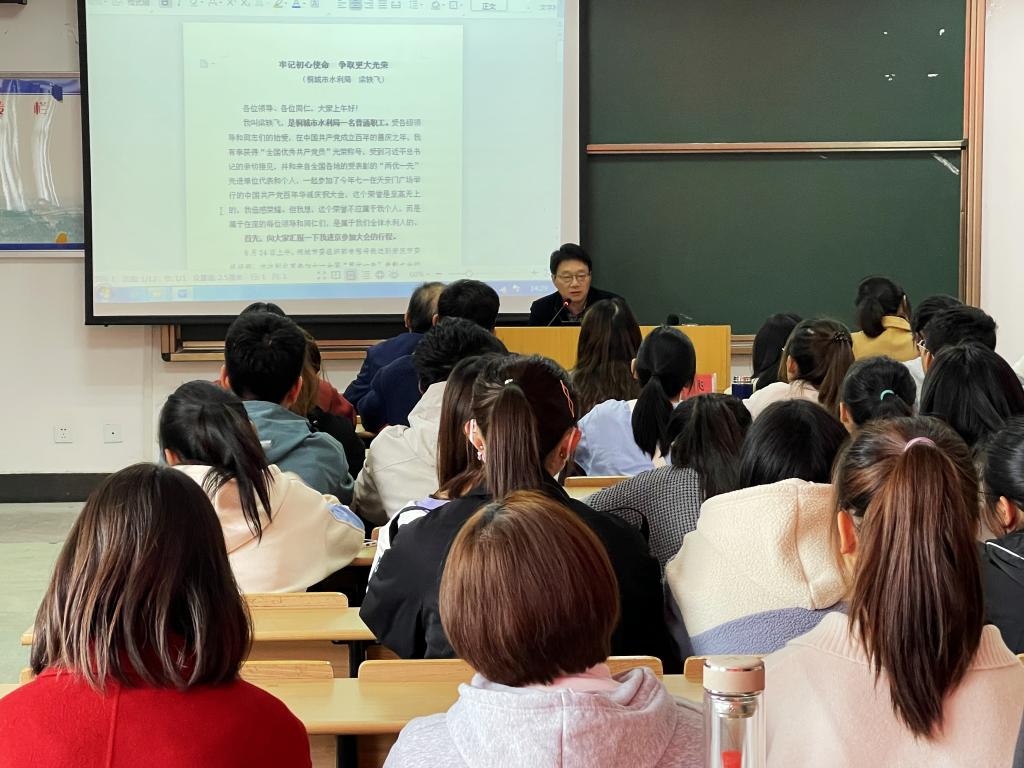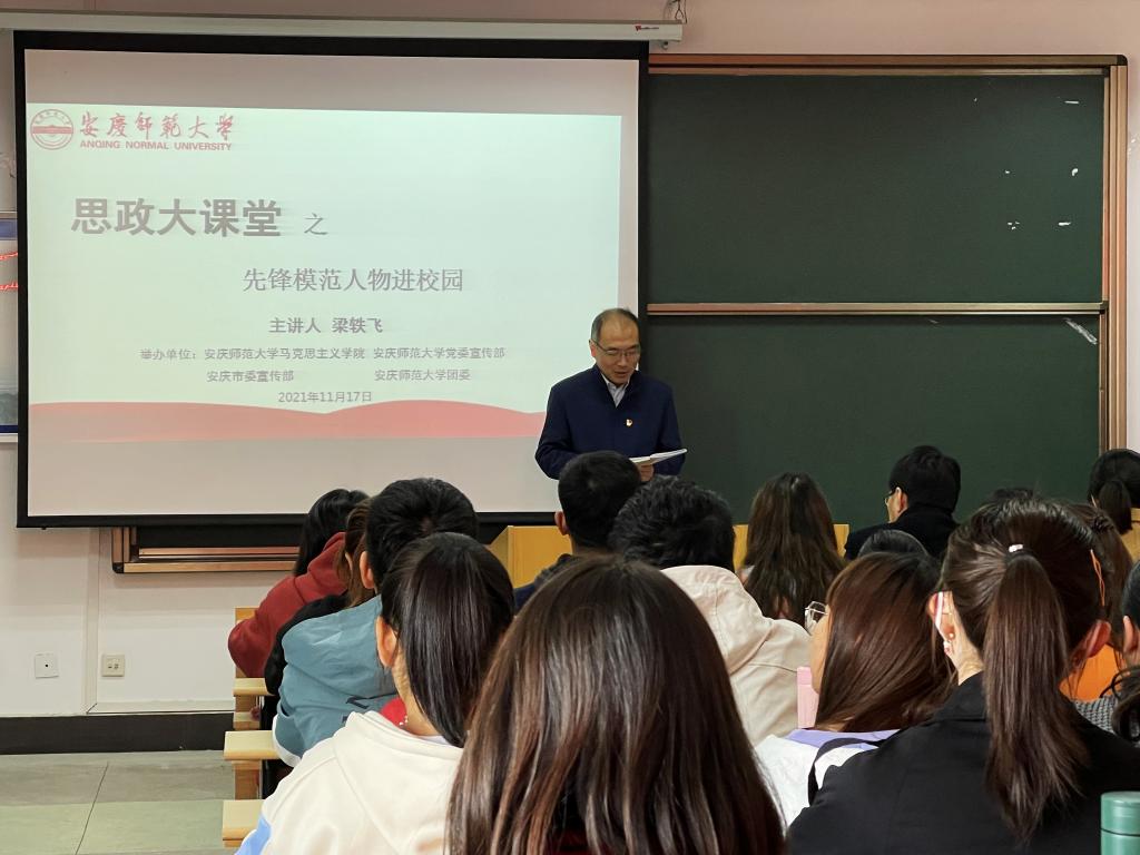 11月17日,365上市公司、学校党委宣传部、安庆市委宣传部、学校团委举办“思政大讲堂之先锋模范人物进校园”专题报告会。全国优秀共产党员——安徽省桐城市水利局党组成员、水利局水保工程建设管理所所长梁轶飞受邀作报告,学院党委书记金文斌、学校团委副书记赵丽丽、学院团委副书记与120多名学生代表参加本次活动。