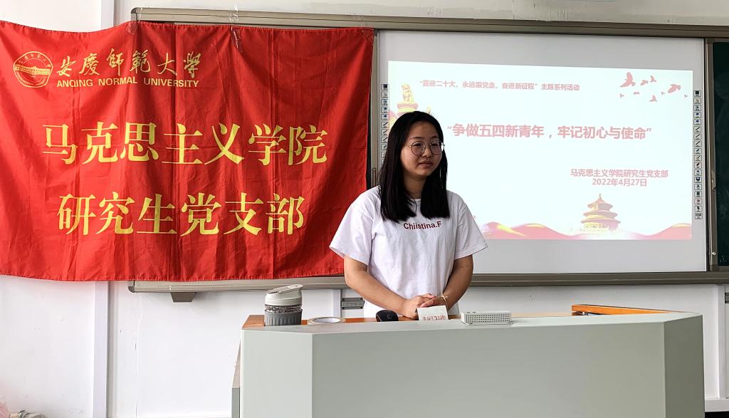 首先,2021级马克思主义理论专业董慧霞为大家介绍了“五四运动”爆发的背景和性质,着重讲述了“五四运动”中青年发挥的主体作用,引出了“五四青年节”的由来。她表示作为当代青年,我们应当牢记历史,继承先辈们的遗志,五四精神是中国青年的宝贵精神财富。