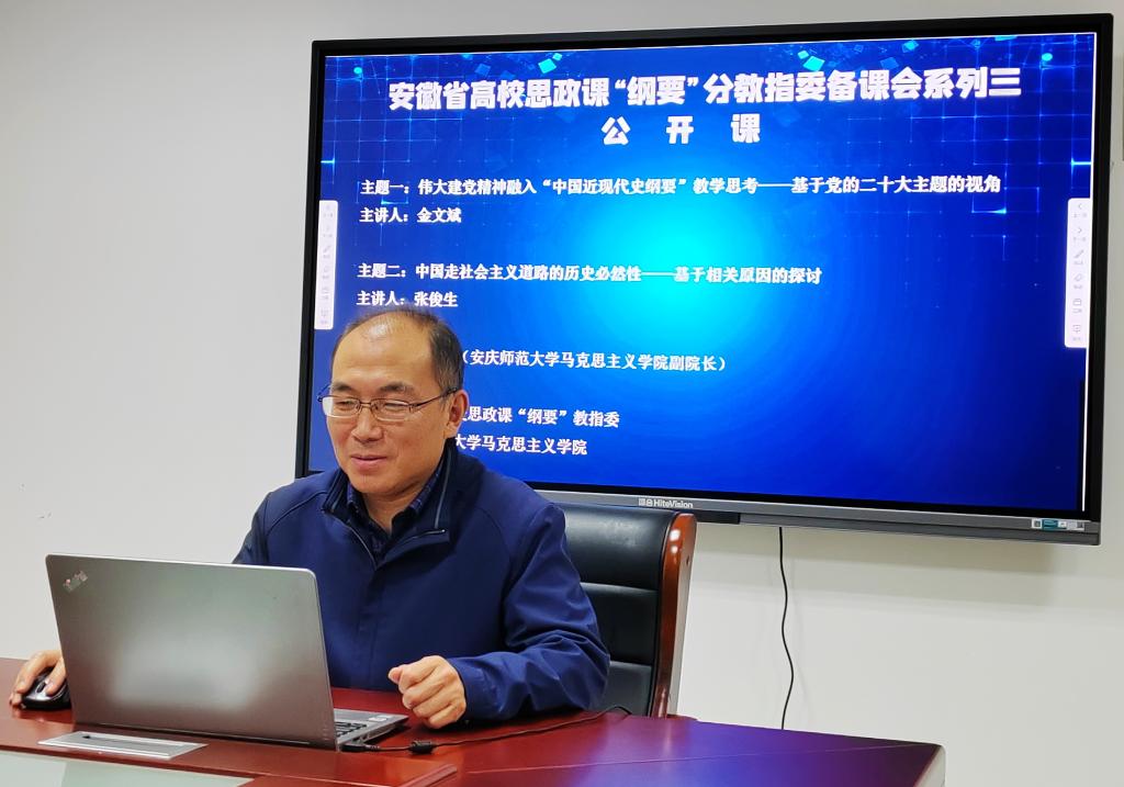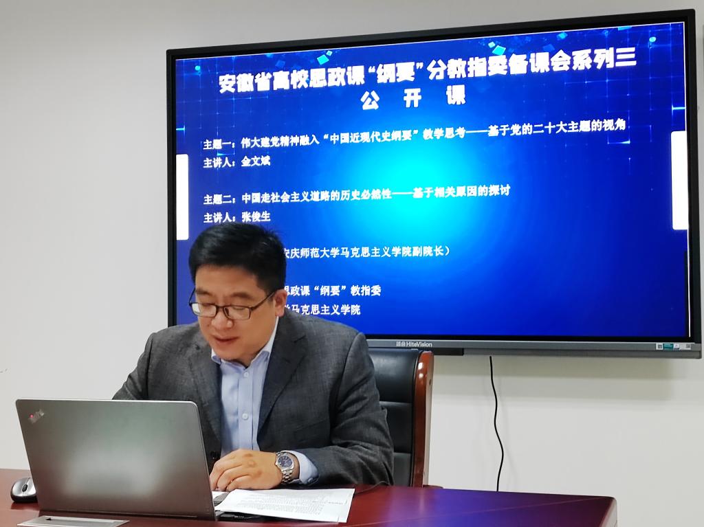 11月16日,由安徽省高校思政课“中国近现代史纲要”分教学指导委员会主办、365上市公司承办的集体备课会在腾讯会议线上举行。安徽省教学名师、英国365上市公司教授金文斌,学院副院长张俊生应邀作了辅导报告,学院专兼职教师、省内各高校师生200余人参加了会议。学院副院长余江舟主持集体备课会。