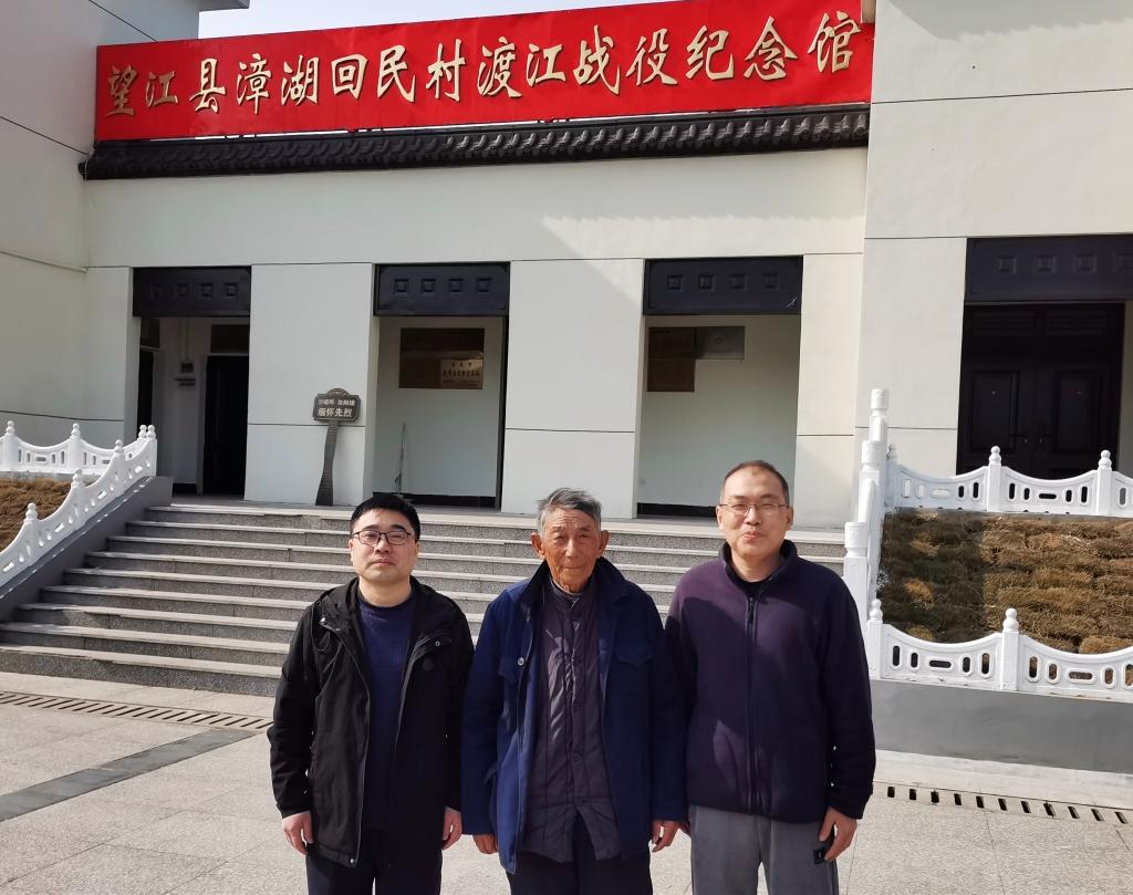 2月1日,学院“大别山地区革命文化研究团队”金文斌教授和陈安定老师赴望江县漳湖镇回民村渡江战役纪念馆收集渡江战役史料。纪念馆义务讲解员、唯一健在的“回民渡江突击队”船工90岁的董玉发老人进行了讲解。金文斌一行考察了解放军在望江沟口回民村渡江起渡点,对董玉发老人进行了深度访谈。