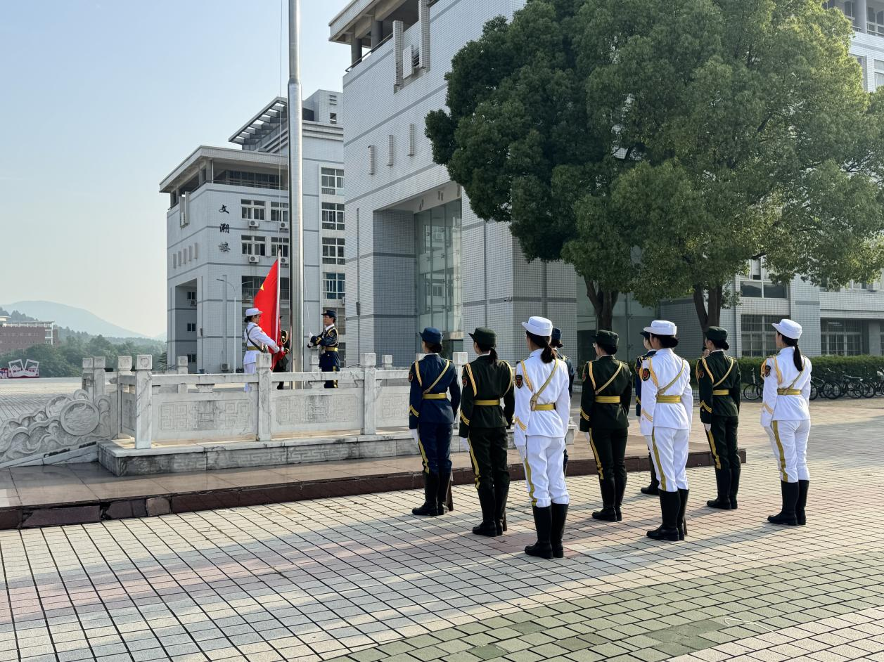 上午七时整,国旗护卫队的同学们迈着整齐划一、铿锵有力的步伐,护送国旗入场,伴随雄壮激昂的国歌奏响,五星红旗迎着初升的朝阳冉冉升起,全体同学肃立致敬,行注目礼,表达对祖国的无限热爱和崇高敬意。