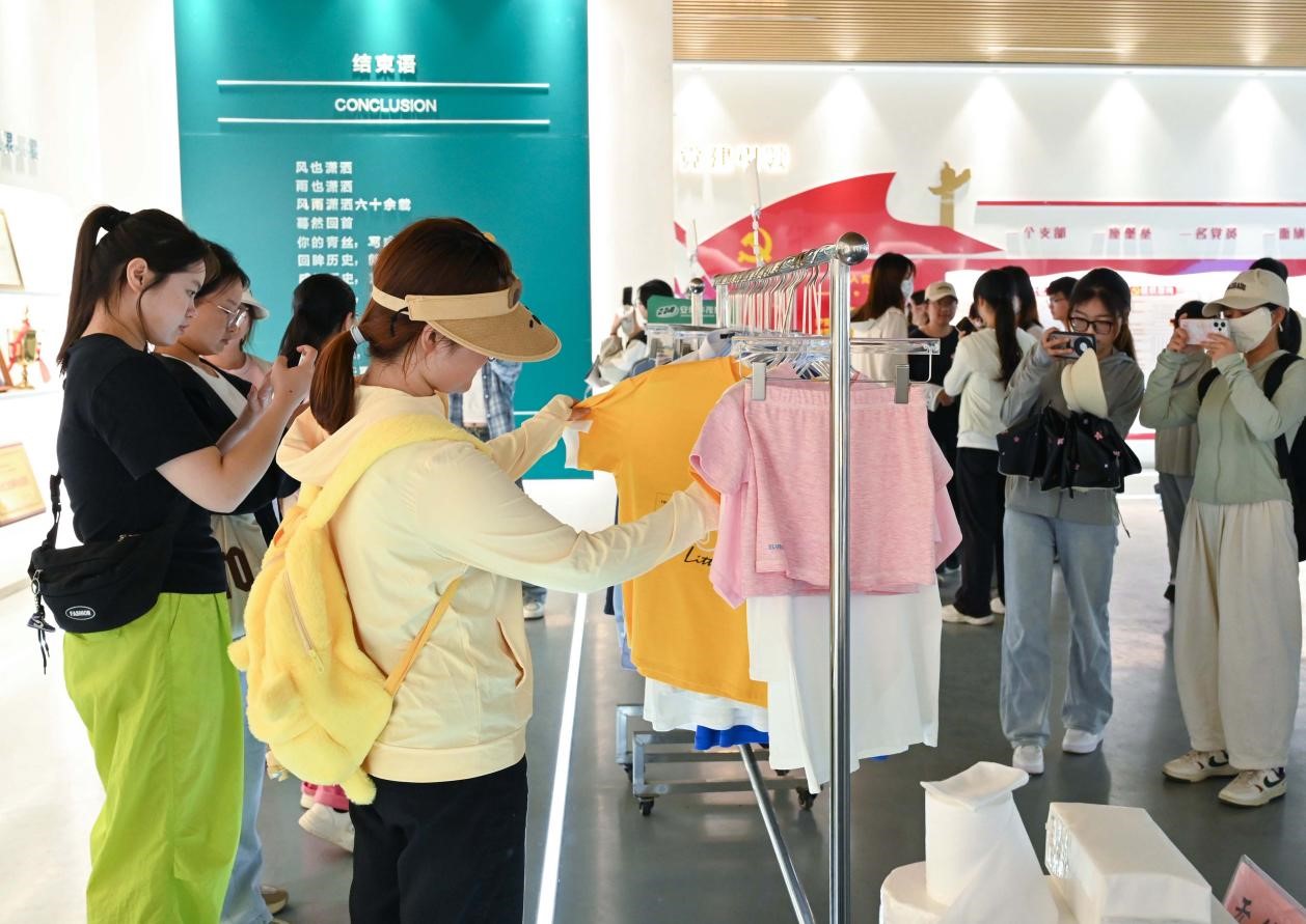 棉纱印染的细腻山水画卷,100%纯棉打造的柔软棉柔巾,纹样精美的色织匹染面料……步入产品展示区,华茂纺织厂以技术创新打造的的特色产品令学生们眼前一亮。“普通棉花经劳动者的巧手,转化为兼具实用功能与美学价值的产品,这正是‘劳动创造无限可能’的生动诠释。”思想政治教育专业2023(2)班的计振康说到。展厅里,两面红旗吸引学生们驻足拍照打卡,这两面国旗正是嫦娥五号和嫦娥六号登月展示的特殊材质的国旗(原样)。“这两面国旗是华茂和武汉纺织大学等单位联合研发的,嫦娥六号登月展示的国旗是中国首次在月球背面独立动态展示的国旗,也是世界首面玄武岩红旗。”听了讲解员的介绍,思想政治教育专业2024(2)班的李震感慨道,原来纺织技术还可以这样应用。