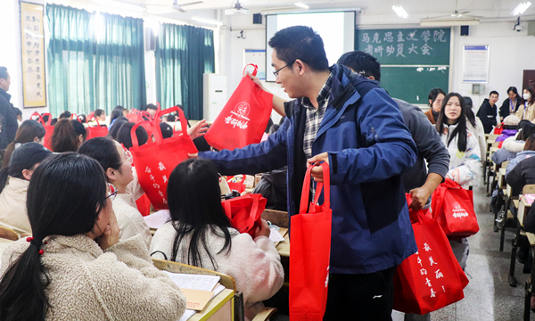 当印有“奋斗的青春最美丽”的福袋被搬进班级,学生们发出阵阵惊叹,福袋里装着一个保温杯、一封爱心信和一个文具袋。思想政治教育专业2018(3)班的江澜收到福袋后直呼惊喜,“这份礼物太贴心了,最让我感动的是爱心信,考研时间逐渐逼近,看到学弟学妹们的暖心祝福我感到放松了许多。”她介绍自己曾为考研学子和新生们写过爱心信,如今自己也收到了学弟学妹的来信,爱心信是学院的一个传统,温暖了一代代马院学生。