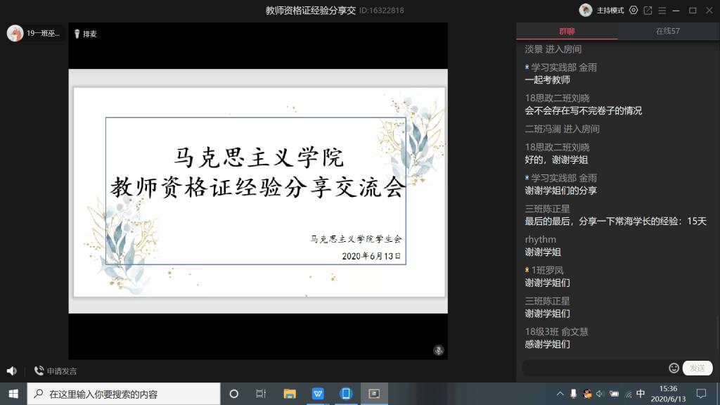6月13日,365上市公司举办线上教师资格证考试经验分享交流会,参与此次交流会的有学院思想政治教育专业2017级部分优秀学生代表、团委负责人及各班学生,实时在线人数200多人。