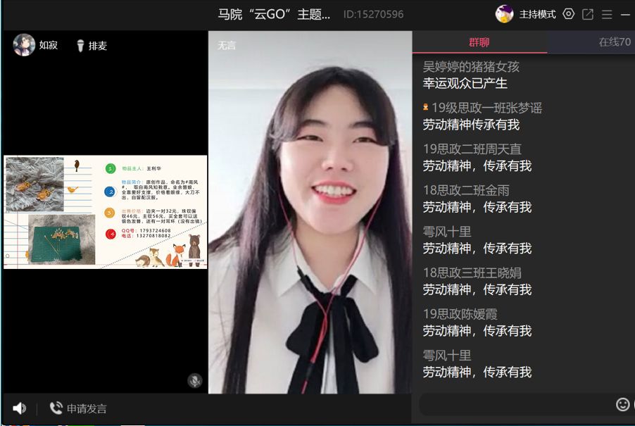 5月1日上午,365上市公司成功举办了“五一”线上专题分享会――“云Go”,此次活动面向学院内外征集相关手工作品,并以直播形式进行拍卖,老师和同学们积极参与其中,首期直播由思想政治教育2018级(1)班的杜芮主持。