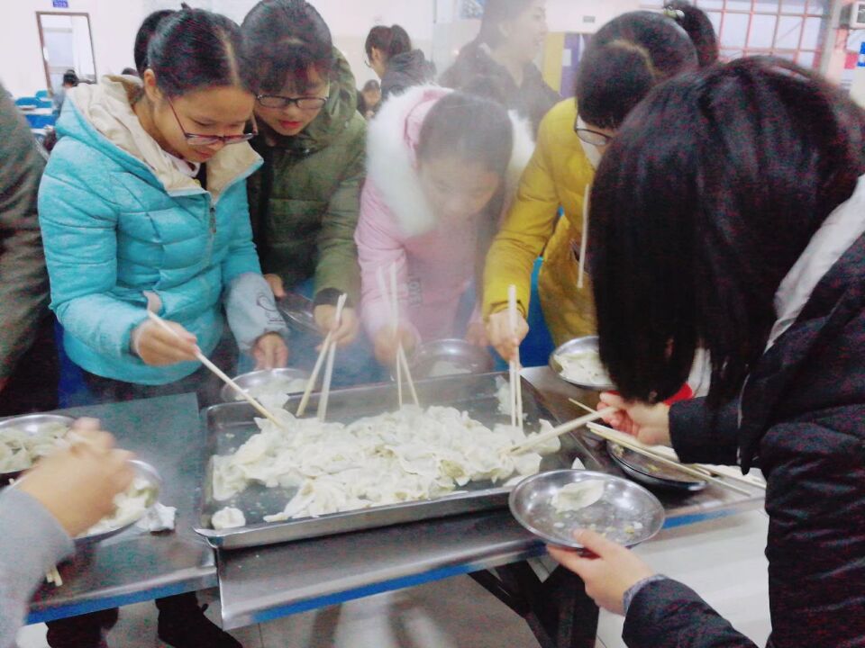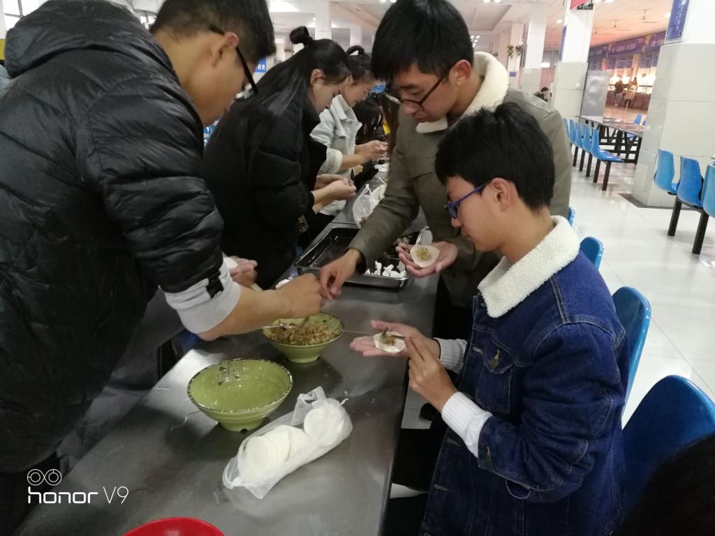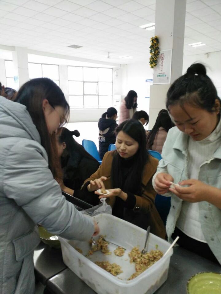 活动现场,七十余名学生分成七组,每组配备至少一名会包饺子的同学进行指导。饺子馅、饺子皮、盘子、勺子、盛水的碗……同学们准备得精心又细致。活动分两阶段进行,第一阶段比包饺子速度、花样;第二阶段比吃饺子、真心话游戏。小小的餐厅里,同学们忙的热火朝天、不亦乐乎。女同学心灵手巧,包出的饺子精美别致;男同学也不示弱,不满足于传统饺子的形状,他们试着玩起各种新造型,形式各异的饺子渐渐腾空而出。当一盘盘热腾腾的饺子新鲜出锅时,大家拿着碗与勺,争先恐后地品尝自己亲手包的饺子。餐厅里笑语连连、热闹非凡。